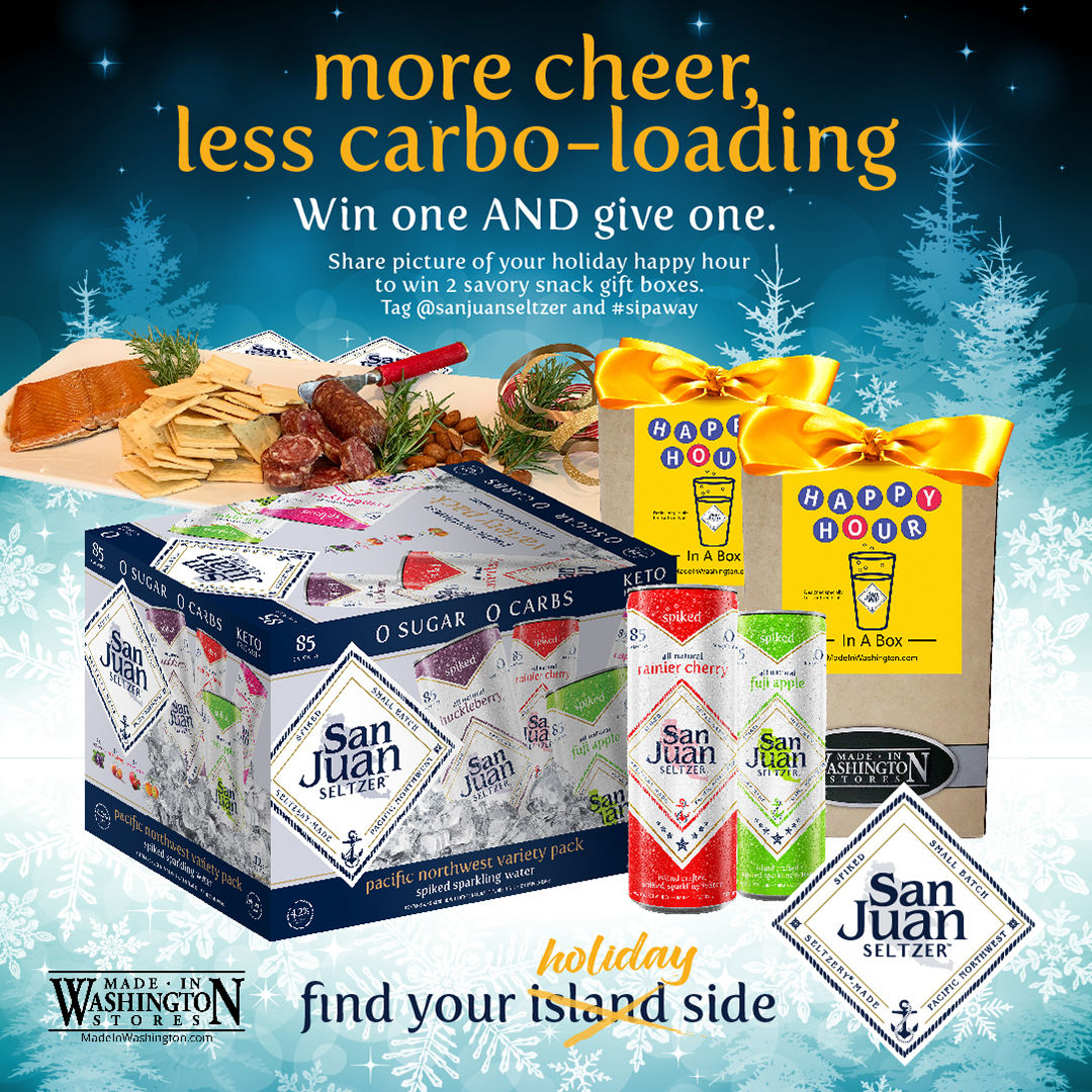 To enter the Sweepstakes on Instagram, log into your Instagram account, post a photo and tag @SanJuanSeltzer + @MadeInWashingtonStores with a photo of you sharing your holiday happy hour and cheer. This can be a photo of you, you and your friends, you and family, or a virtual gathering enjoying all things and activities related to the holidays. Include the hashtag #SipAway to also receive an entry into the drawing.